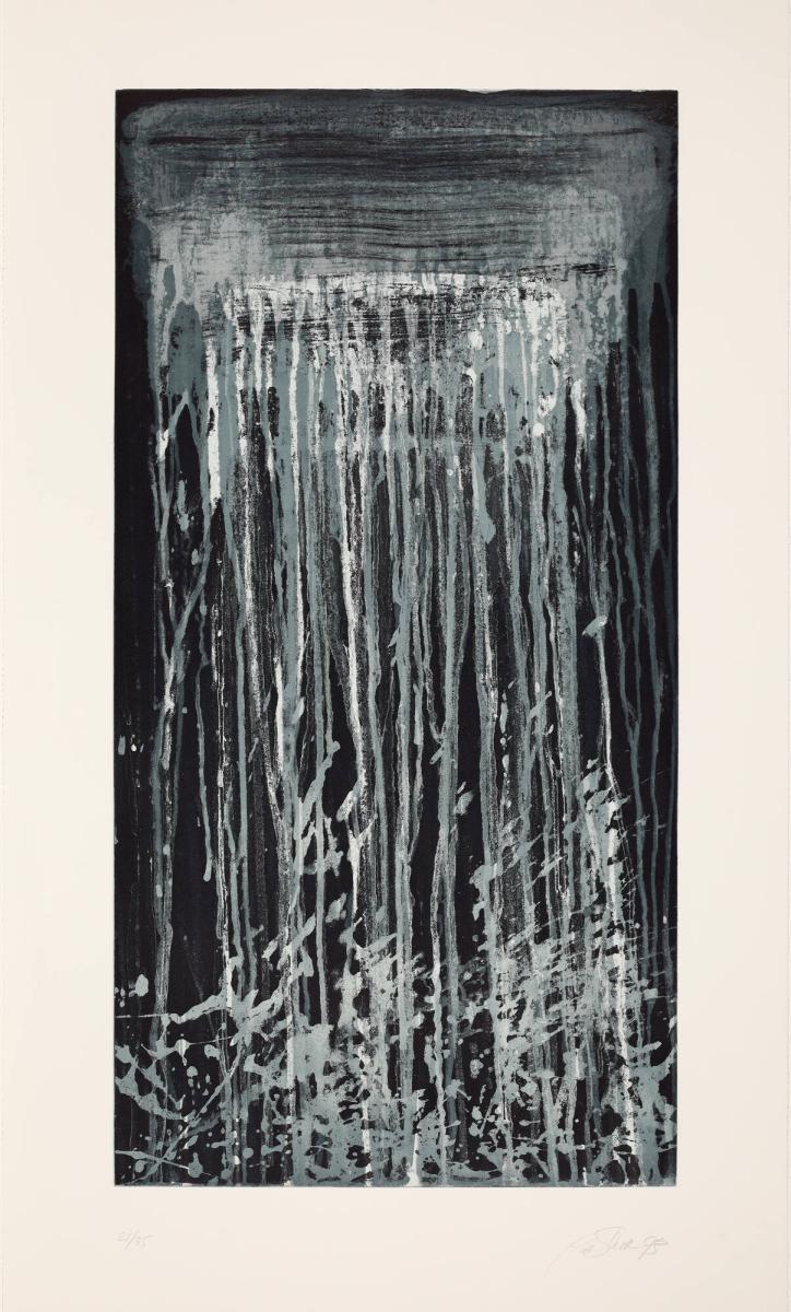 This print is based on one of Steir’s iconic Waterfall paintings, which she has been making since the late 1980s. This body of work developed out of several pivotal moments in her career. Her friendship with composer John Cage led her to incorporate elements of chance into her painting process. In the early 1980s, her travels to Japan and exposure to Japanese woodcuts and Chinese literati landscape paintings also contributed to what would become her Waterfall works. She makes these by pouring paint onto the canvas without a brush and letting gravity determine the outcome—channeling the force and motion of a waterfall rather than trying to represent it illusionistically.
