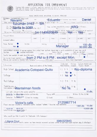 Not on viewNavarro works across many mediums, exploring the relationships among humans, animals, and nature. This drawing comes from his series, Apply , in which he downloaded job applications to work at Starbucks, Pizza Hut, Victoria’s Secret, and other large U.S. companies. He printed, projected, and redrew the applications by hand. The enlarged scale of the drawings brings an ironic sense of monumentality to the dehumanizing experience of applying for, not to mention working in, underpaid jobs at large corporations.