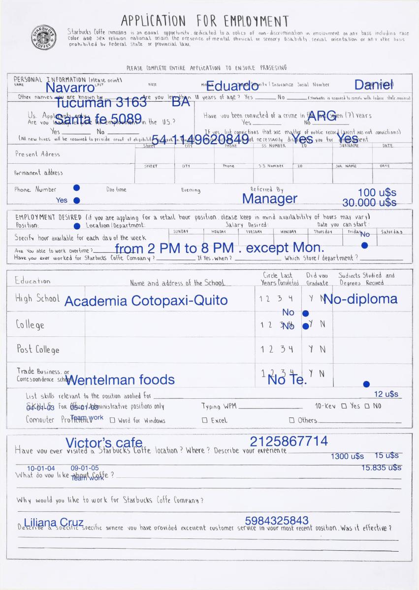 Not on viewNavarro works across many mediums, exploring the relationships among humans, animals, and nature. This drawing comes from his series, Apply , in which he downloaded job applications to work at Starbucks, Pizza Hut, Victoria’s Secret, and other large U.S. companies. He printed, projected, and redrew the applications by hand. The enlarged scale of the drawings brings an ironic sense of monumentality to the dehumanizing experience of applying for, not to mention working in, underpaid jobs at large corporations.