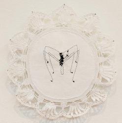 MediumHand embroidery on found doily and pins