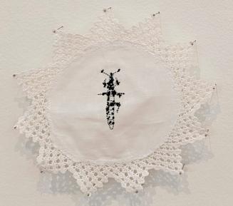 The front side of these embroidered doilies is turned to face the wall, leaving the back, with loops and knots, facing the viewer. This display reveals the work’s elaborate and messy construction, rather than the deceptively neat result. Yamamoto thinks of these insects, and her renderings of them, as metaphors for the complexity of Hawaiian multi-ethnic identity.