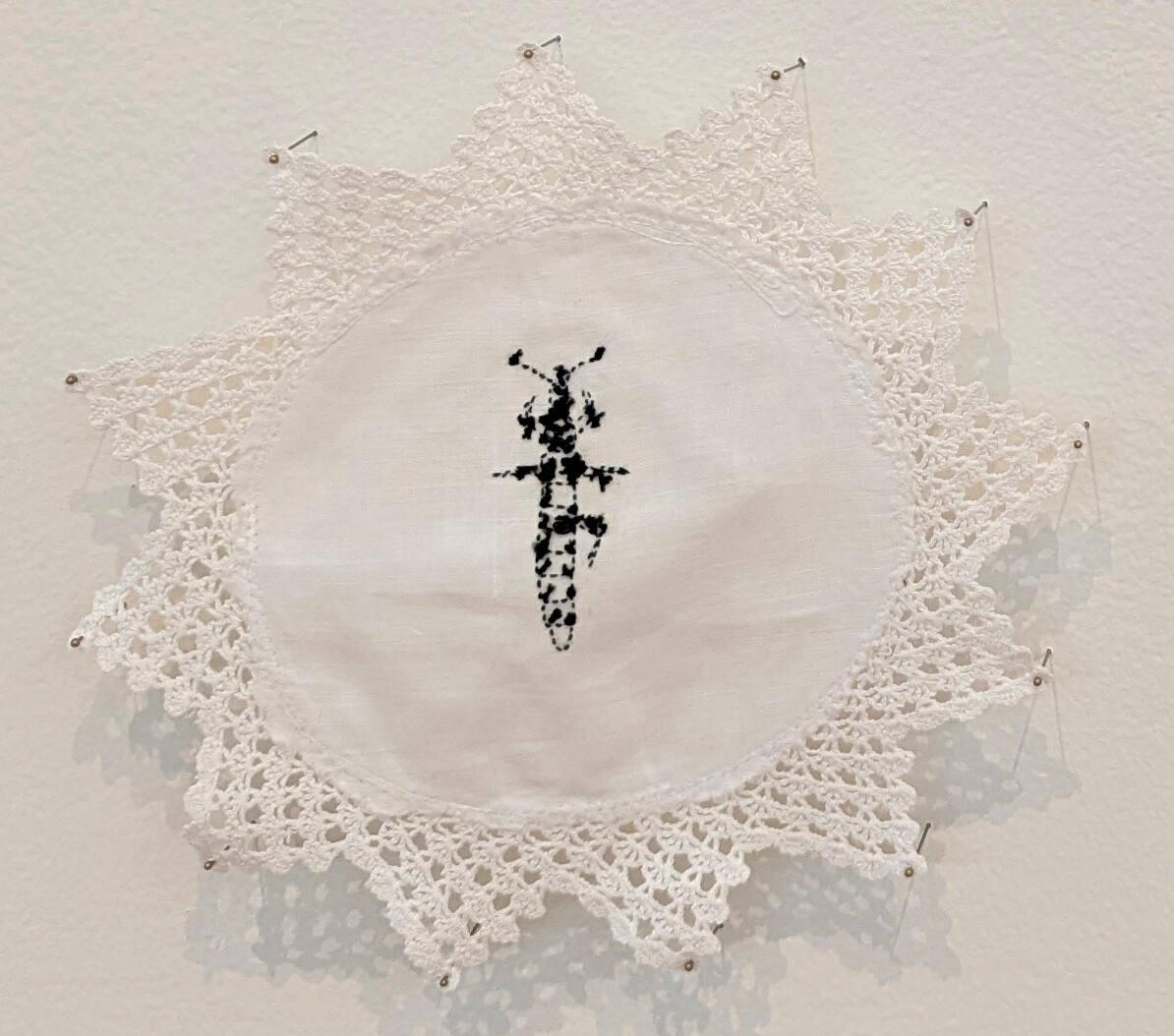 MediumHand embroidery on found doily and pins