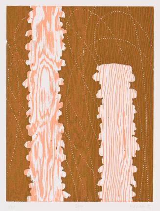 Watt is best known for her sculptures made from used blankets and tin jingles. In this print, Watt combines her material interest in textile with her background in printmaking, using a sewing roulette wheel to puncture the woodblock from which these prints were made.