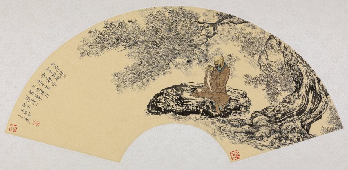 On viewLuóhàn (罗汉, 羅漢) are Buddhist deities who have vowed to help believers and protect the Buddhist teachings, or Dharma, until the coming of the next Buddha. Here, a luóhàn sits on a large rock under a pine tree, carefully threading a needle. There is a traditional subject in East Asian art in which luóhàn are shown performing everyday chores—making sandals, washing laundry, stitching robes—expressing the idea that enlightenment is not only experienced in meditation but permeates all aspects of life.