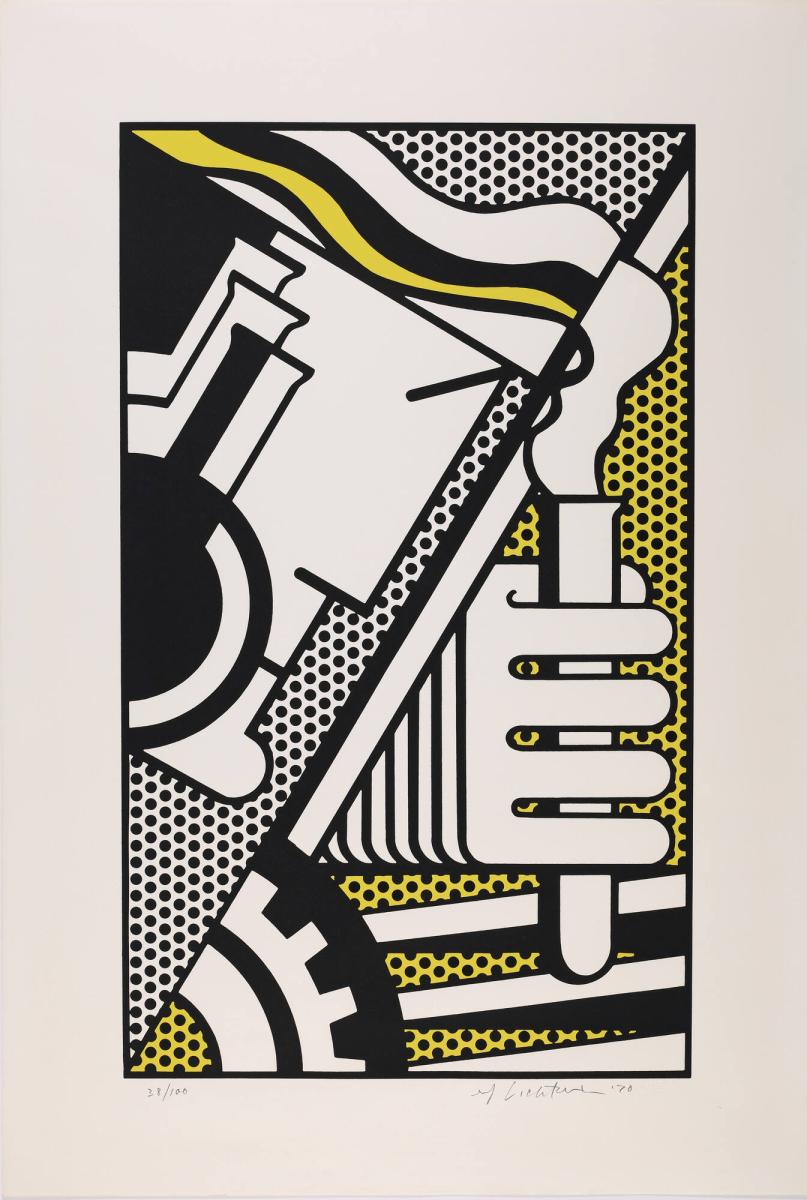 Not on viewPrinted with Lichtenstein’s signature Ben-Day dots, this print combines the graphic imagery of comic books with symbols of modern industry. Chem IA was originally designed as one third of a larger print, Peace Through Chemistry, depicting the advent of farming, then industry, before culminating in Chem IA, positioning human mastery of chemicals as the logical culmination of this development. Without the other two images to contextualize this print, the image of a block human head in profile peering into a billowing test tube is enigmatic rather than victorious.
