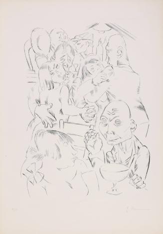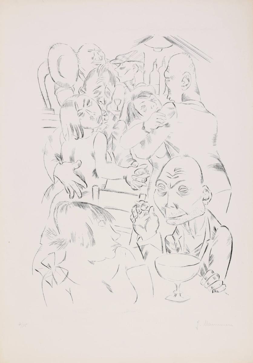 Not on viewThe word Kaschemme comes from Romani language, referring to a disreputable bar or restaurant. In this seedy and cramped space, subjects drink, smoke, and dance to music issuing from a gramophone. Almost none look at each other, and when they do it is with a hollow, lifeless expression. Their psychological emptiness and fatigue is typical of graphic work from Weimar-era Berlin.