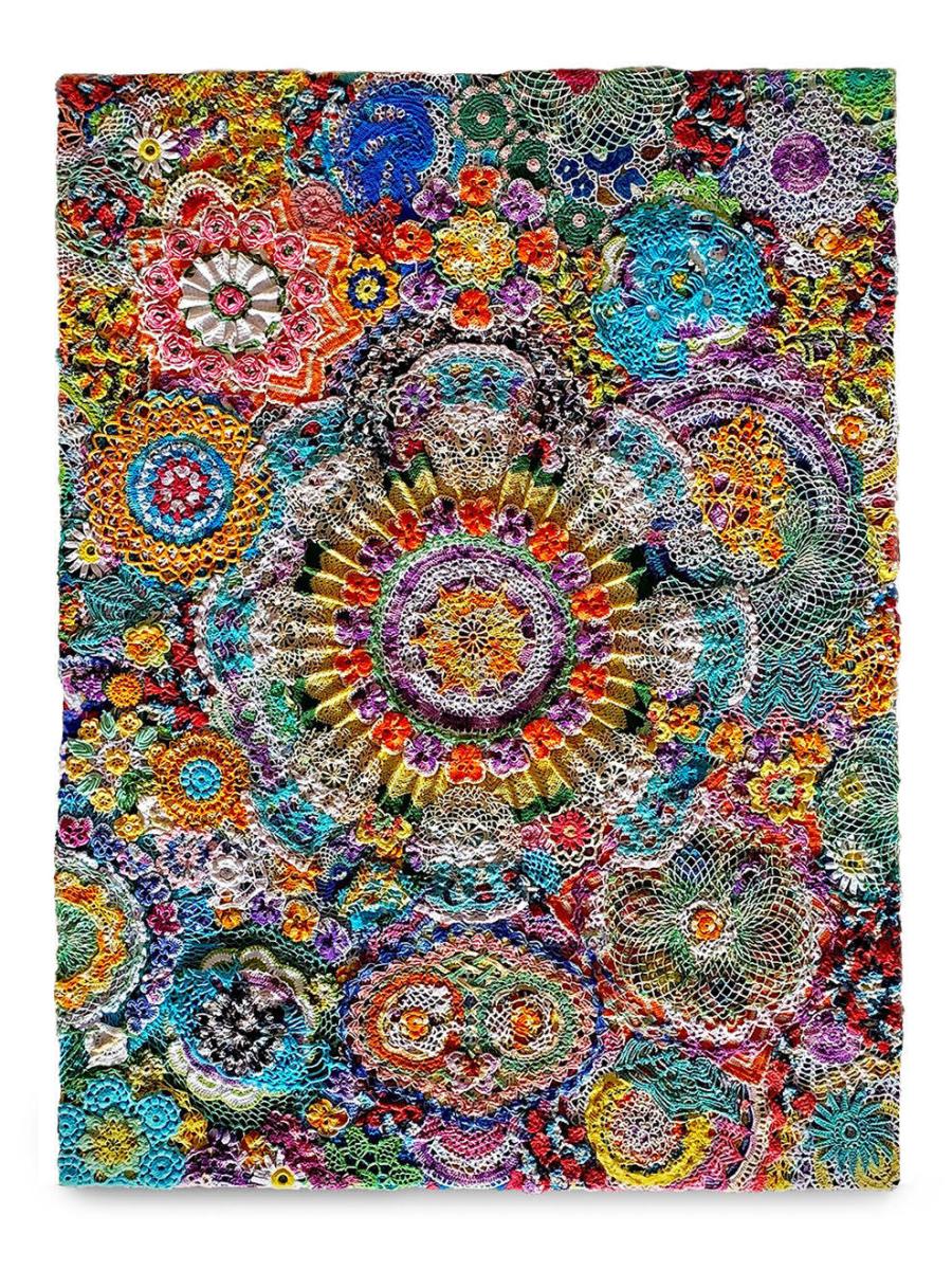 On viewThese radial forms and brilliant colors recall Canboulay, a precursor to carnival in Trinidad and Tobago, which Ové celebrated as a child. Having grown up around his family’s dress shop, Ové is interested in honoring the anonymous women laborers who made these doilies, which he sourced globally. “I became interested in a sort of ‘Granny Psychedelia’—that these doilies were often made by repressed women through the 1970s and 1980s in Catholic homes across South America, Eastern Europe, and Africa.”