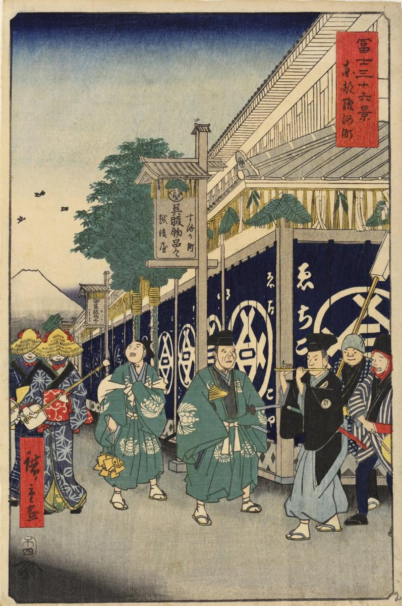 Street Musicians Outside the Echigoya Clothing Store at Surugacho at the Beginning of the New Year, no. 2 from Thirty-six Views of Mt. Fuji