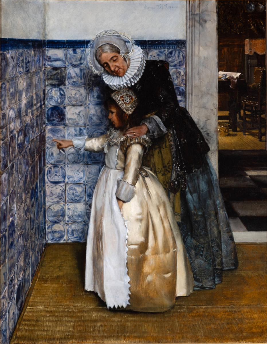 On viewAlthough this work was painted in England towards the end of the 19th century, Alma-Tadema fabricates an intimate glimpse of a well-appointed 17th-century Dutch home. A young girl recounts biblical narratives illustrated on Delft tiles (a type of tin-glazed earthenware meant to imitate the appearance of hard-paste porcelain imported from China and Japan). In the background, the abandoned knitting needles draw a connection between women, craft, and the domestic sphere. The other decorative arts demonstrate an early-modern fascination with imported luxury objects.