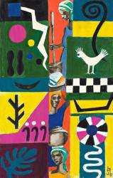 The impact of her travels throughout Africa and the Caribbean are apparent in work of the 1980s and 1990s, such as the Allen’s acrylic, Symbols d'Afrique. It was likely made in preparation for a larger painting, other examples of which are also based on a gridded structure, such as Mère du Senegal (1985) and Initiation Liberia (1983) in the collection of the Smithsonian American Art Museum, Washington, DC. In Symbols d'Afrique, a central column shows three figures involved in everyday chores, perhaps churning some liquid, grinding grain, and carrying vessels. The blue leaf in the lower left corner may be a nod to the cutouts of Henri Matisse, while the rooster on the right side references an important element of Haitian visual culture, in which roosters are revered and play a prominent role in vodou ceremony.