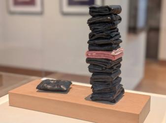 On viewWatt gathers blankets and other textiles from group sewing circles and open calls and incorporates them into her Blanket Stories sculptures. Many of the blankets are accompanied by a tag on which owners write their ancestral and personal stories. Watt sees her role as a custodian of the blankets’ stories and the communities that they come from, folding and stacking the blankets into tower-like forms. This piece is among the first that Watt cast in bronze, combining hard, cold metal with soft, warm textiles, both speaking to permanence and history in different ways.