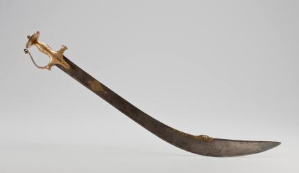 On viewThe tegha was a type of talwar, a sword popular throughout South Asia that combines a curved blade (originating in Central Asia) with a handle, or hilt, design unique to India. It has a distinctive round disc at the bottom and was designed to fit the hand tightly for a secure grip. Compared to other talwar, tegha have a blade that is wider toward the tip, giving added force to cuts. This blade was made from wootz steel, a beautifully patterned crucible steel invented in southern India. The hilt and knuckle-bow protecting the fingers are decorated with koftgari using a Persian technique mastered by Indian artisans, in which steel is inlaid with gold or silver.