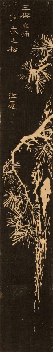 Not on viewThis small woodblock print, with a white image on a black background, imitates the appearance of an ink rubbing. The subject is a pine tree made famous in the Noh play Hagoromo 羽衣, or The Feathered Robe. In it, a goddess known as a tennin 天人 is flying over the pine grove at Miho Bay, and becomes captivated by the beautiful scenery. She removes her magical feathered robe to bathe, hanging it on a pine tree, where it is discovered by a fisherman. He refuses to return the robe until she agrees to dance for him. Since she cannot fly back to her home on the moon without it, she agrees. He returns her robe and she dances, while the chorus describes the beauty of the spring scenery and of her robe. In the end, she returns to the heavens.