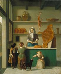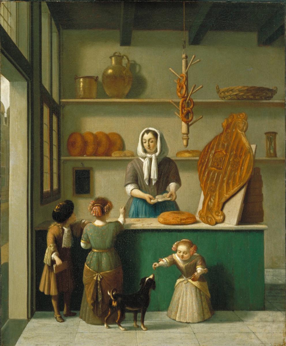 Bread was an important part of the 17th-century Dutch diet. Grain from the Baltic was integral to Dutch prosperity and came to be called the moedernegotie (mother trade). In this work, a large duivekater—a sweet white bread baked in North Holland around the Feast of Saint Nicholas (December 6)—alludes to the economy’s heavy dependence upon grain.