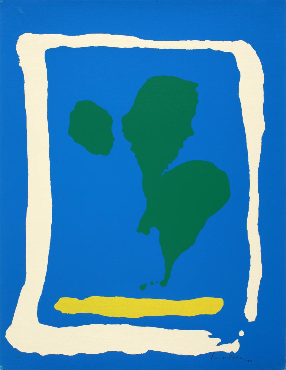Frankenthaler initially explored printmaking at the recommendation of her artist-friends, namely Grace Hartigan. Accustomed to creating paintings through spontaneous, diaphanous applications of color, Frankenthaler had to alter her artistic process to register and print three different screens of blue, dark green, and yellow ink to produce Air Frame, her first silkscreen. Air Frame was printed for the portfolio New York Ten, which features works by other major artists like Jim Dine, Roy Lichtenstein, and Claes Oldenburg. Frankenthaler was the only woman included in this project.