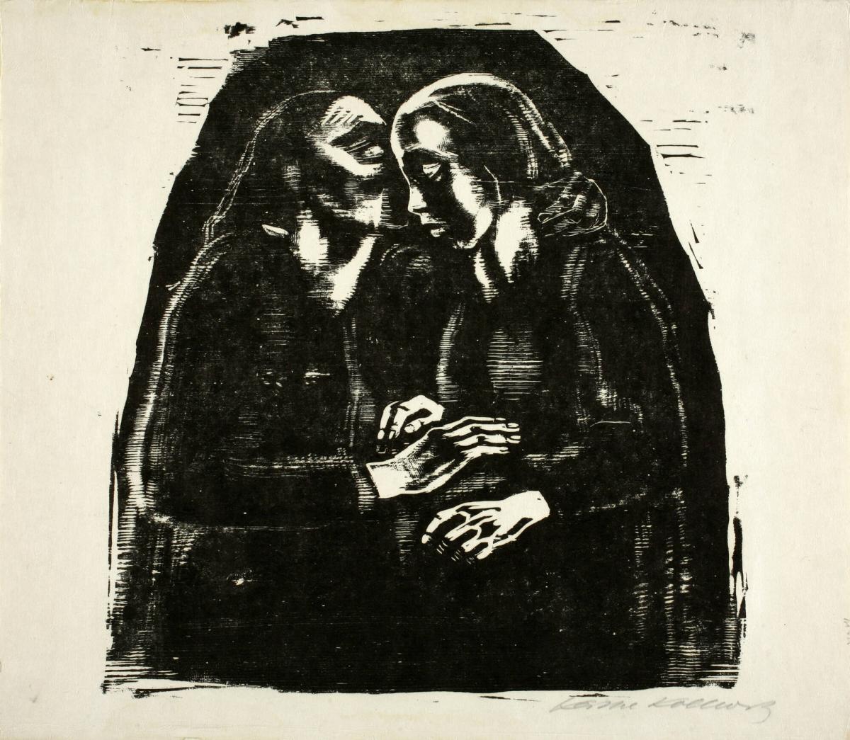 Not on viewKäthe Kollwitz rarely created artwork related to biblical themes, but in the case of this print she produced an image of two Christian women whose identities as mothers seem to have deeply resonated with her. The scene derives from the Visitation, an episode recounted in the Gospel of Saint Luke in which a recently pregnant Mary visits her cousin Elizabeth to reveal the news of her own divine conception. At the moment when they meet, Elizabeth also becomes miraculously pregnant with John the Baptist. Both women are united in their roles as mothers of holy children, a relationship that is visually reinforced by the stylistic affinities shared by the two figures. Like Mary and Elizabeth, whose own sons would be martyred, Kollwitz also experienced the tragedy of losing a child. Her son died while fighting in World War I, and his death inspired the subject matter of many of her prints during the following decades.