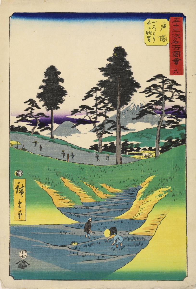 Distant View of Mt. Fuji from the Mountain Road in Totsuka, no. 6 from the series Pictures of Famous Places of the Fifty-three Stations [of the Tōkaidō]