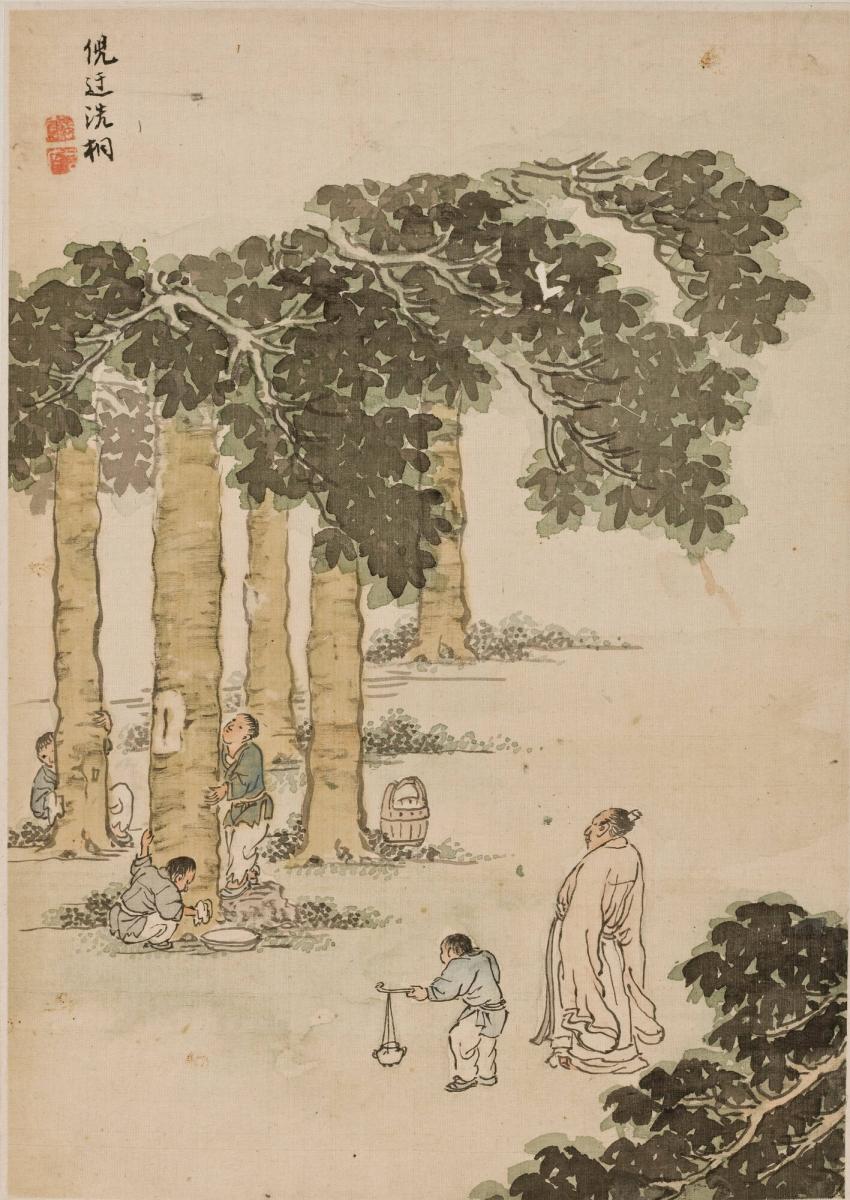 An immaculately dressed man in a peach-colored robe watches over young servants who are washing trees. Another servant near the man carries a censer to mask any foul odors that might offend him. The scene is cleverly composed, with implied diagonals creating a sense of space, and linking the man to the workers.