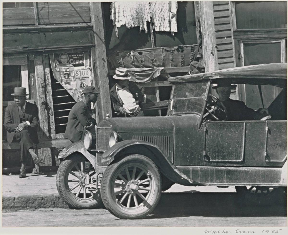 During the Depression, Evans photographed poor, rural people in what he believed were unsentimental, direct, and objective ways. From 1935 to 1938, he worked for the Farm Security Administration's (FSA) Historical Section under the directorship of Roy Stryker, who also hired other photographers including Shahn, Arthur Rothstein, Gordon Parks, and Dorothea Lange. Sidewalk in Vicksburg, Mississippi, made for the FSA, shows how deeply immersed Evans was in photographing the American scene, recording commonplace subjects impersonally. Here, an automobile with only its front half visible is parked in front of a wooden building with men idling outside in midday sunshine. Evans often made a number of photographs of the same scene; half a dozen other exposures (in the FSA Collection, Library of Congress) capture different moments: a close-up of some of the men, general views of the street, and various storefronts.