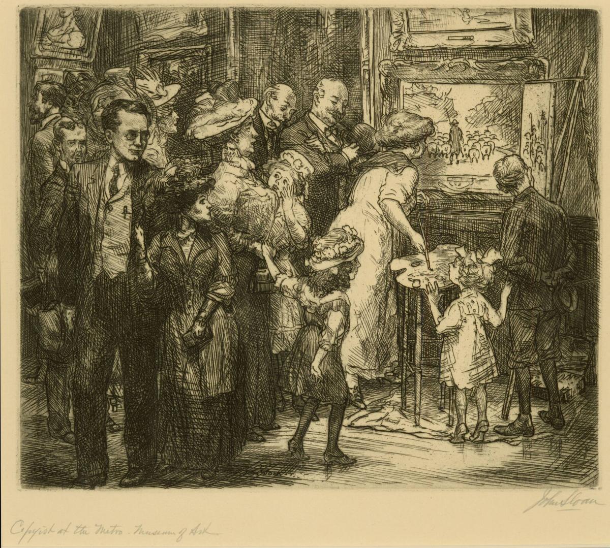 Not on viewNoted for the close observation and realism of his depictions of the contemporary urban scene, Sloan took a dim view of those who copied art rather than life. This vignette of a polite young woman diligently copying an academic landscape painting gently pokes fun at such cloistered, second-hand experiences of the natural world.
