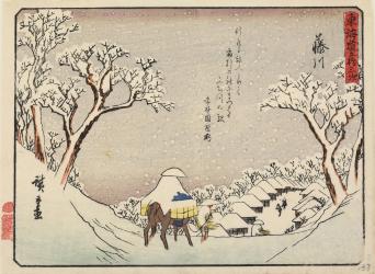 Snow at Fujikawa, with a Poem by Tokiwaen Shigemi, no. 38 from the series The Fifty-three Stations of the Tōkaidō