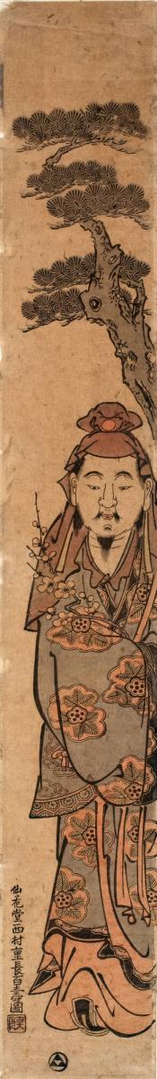 Sugawara no Michizane 菅原道真 (845–903), a nobleman of the Heian Period (794–1185), was a scholar, poet, and statesman who rose to high rank at the imperial court. Embroiled in a power struggle, he was demoted and exiled to a distant province, where he died. Various calamities then struck the capital and were determined to be the vengeance of Sugawara’s angry spirit. To appease him, he was deified as Kitano Tenjin 北野天神. Originally understood to be a storm god, by the Edo period Tenjin had become known as the God of Learning.