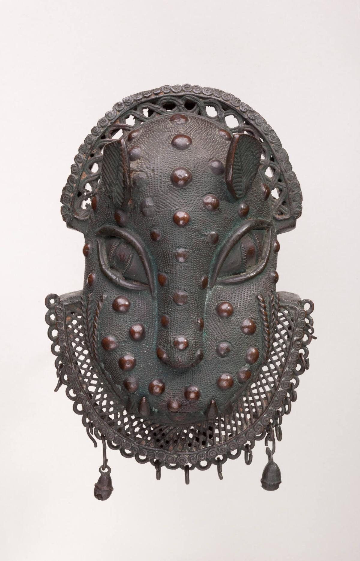 On viewWorking at the request of the oba (ruler), the Benin Kingdom’s prestigious royal brass-casting guild has for centuries produced ceremonial works for the royal palace at Benin City. Made from metals acquired in a lucrative trade with Europeans, their creations served as records of the kingdom’s wealth and traditions. This ornament depicts a leopard, the oba’s sacred animal. Military officers or court officials wore it to symbolize their social status and authority to take human life. Worn at the waist along with other pendant-masks depicting ancestral spirits, this object was distinguished by its small bells, which jangled as the owner walked.