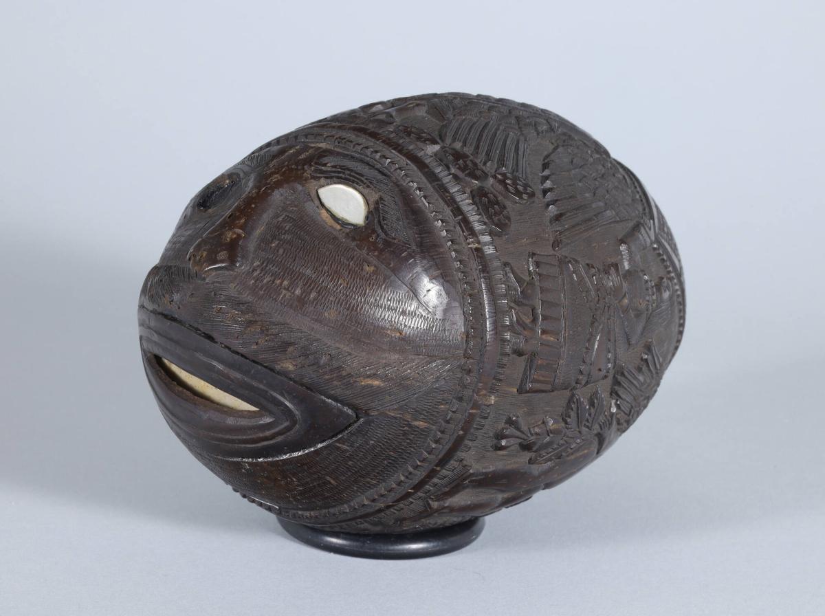 Carved Coconut Bank with Figures and a Face