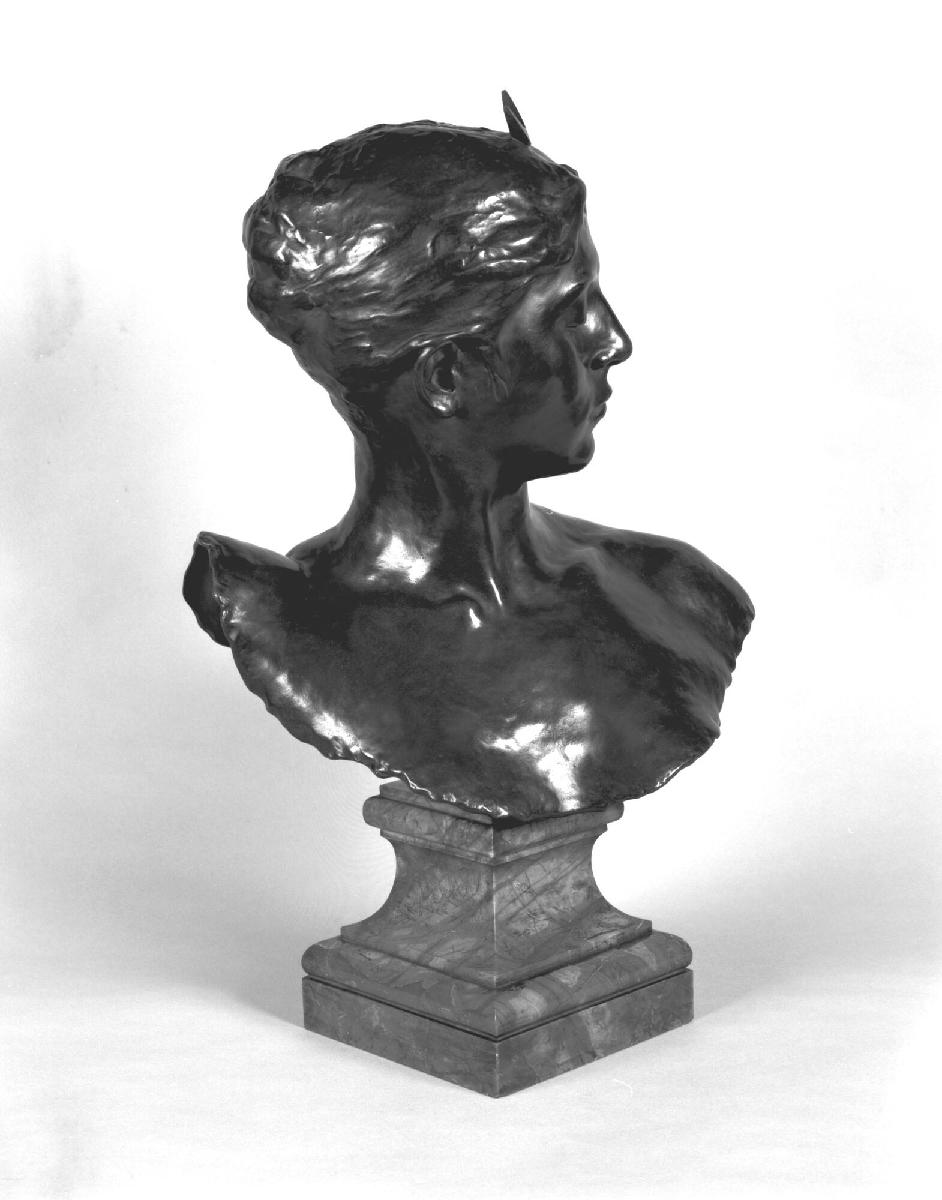Not on viewFalguière began his studies at the Ecole des Beaux-Arts in Paris under the tutelage of François Jouffroy, and won the coveted Prix de Rome in 1859. Celebrated for their graceful form and stylized naturalism, Falguière's sculptures display the conventional classicism of his teacher. The Bust of Diana was derived from the complete figure of Diana, which was exhibited in the Salon of 1882. Beginning in the 1920s, there was a new demand for sculpture suitable in size for the home. This requirement was remedied by the invention of a machine known as the pantograph: a needle traced the surface of the oringal work, and attached by a linkage system to a cutting stylus, a new model was carved in soft plaster whch could then be cast in bronze.
