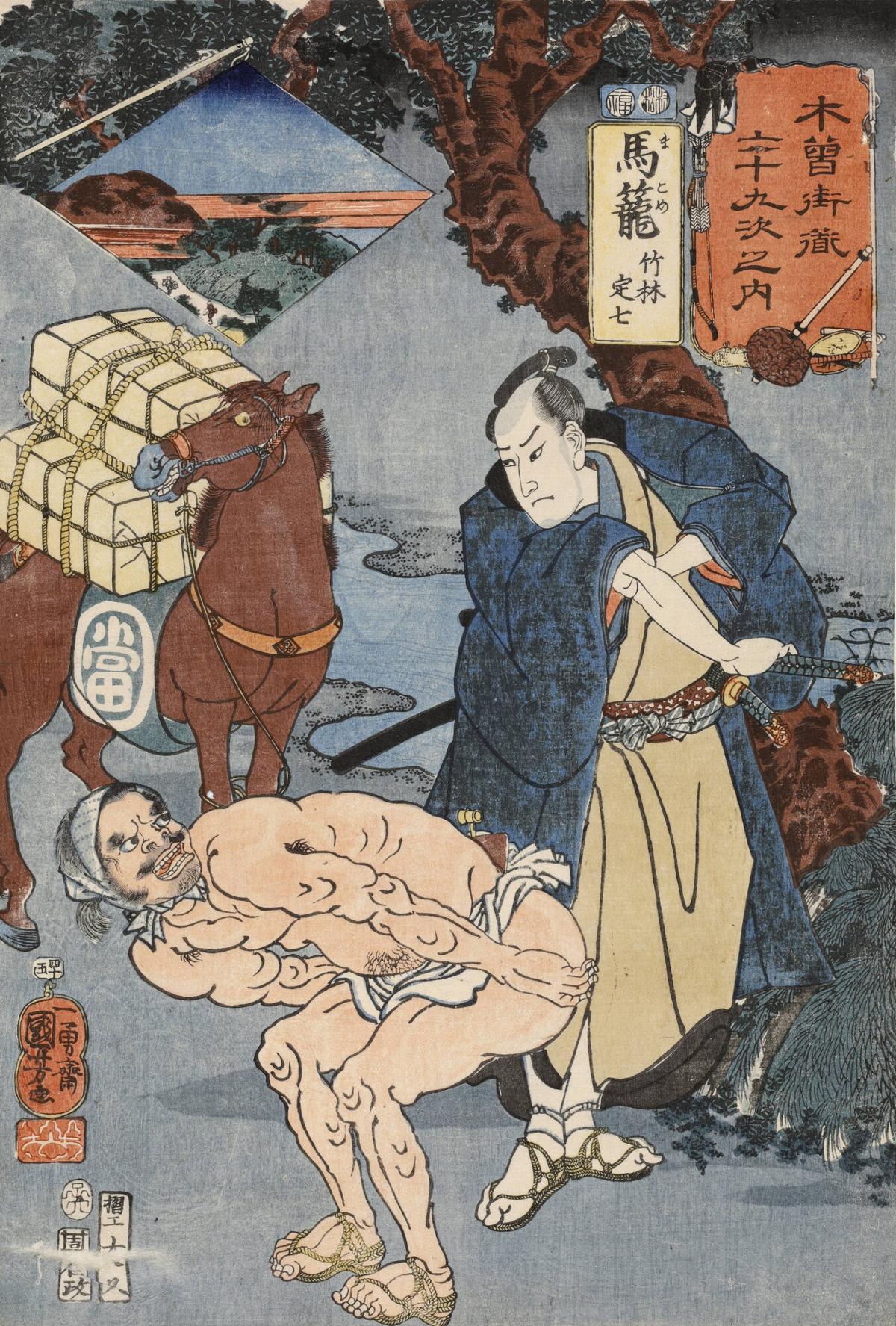Magome: A Horse Leader Offering to Carry Takebayashi Teishichi Across a Stream on His Back, no. 45 from the series The Sixty-nine Stations of the Kisokaidō