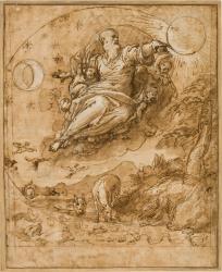 Not on viewThis drawing is preparatory for the central fresco in the chapel vault of the Palazzo Farnese at Caprarola, the retreat of Cardinal Alessandro Farnese. Federico Zuccaro began work on the decoration of the chapel there in September 1566, and the drawing dates to that time or shortly afterward. Below the vault, six other biblical narrative scenes appear in circular frames and the chapel walls show images of the apostles and their martyrdoms, as well as other biblical scenes designed by the artist.