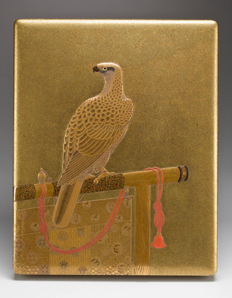 The box consists of three pieces: a bottom, a lid, and an interior tray. It was made to store important papers and other small valuables that needed special protection from light, damp, and vermin. The exterior of the box is decorated with an image of a trained falcon perched on a stand. As in Europe, falconry was an elite hobby in Japan that was historically practiced mainly by members of the samurai warrior class. Although the samurai class was officially abolished in 1868, imagery associated with it remained popular in Japan well into the twentieth century.