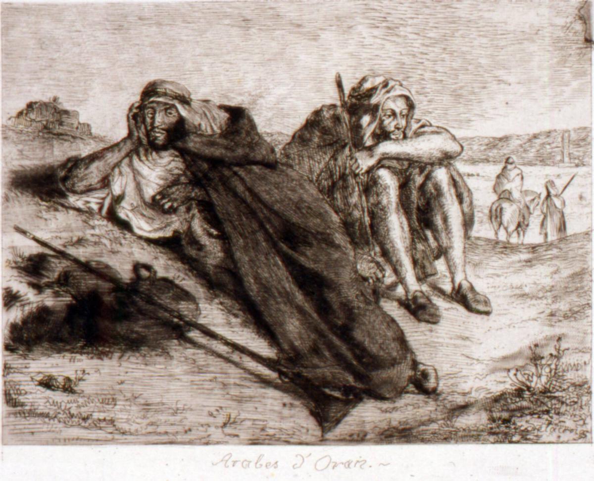 Not on viewThis etching by the famous Romantic painter Delacroix represents one of the many approaches used in the 19th century for “documenting” the peoples and places of France’s expanding colonial empire. The French military conquest of Algeria, begun in 1830 and largely completed by mid-century, opened the way for French and European travelers and settlers seeking new experiences and economic opportunities in this major French overseas colony. The visual arts in this period both reflected and inflected Western imperialist attitudes towards indigenous populations. Delacroix’s etching casts an exoticizing gaze upon the inhabitants of Algeria, depicting them not as they were, but as Westerners imagined them to be.