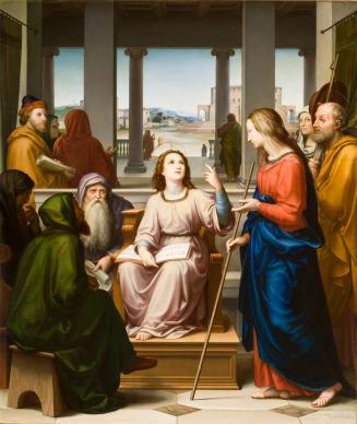 Although the painting seen here is not a copy of a known Renaissance artwork, Rohden’s use of color and compositional balance pays homage to the Italian artist Raphael (1483–1520). As recorded in the New Testament Book of Luke, a 12-year-old Christ, bathed in light, sits at the center of the canvas. To his right are the elders, while Mary and Joseph stand to his left. Rohden included a codex on Christ’s lap with Old Testament Hebrew inscriptions from the Book of Daniel 9:24.