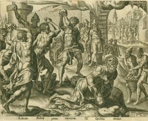 Not on viewThe story of Ahab, Naboth, Jezebel, and Elijah from the Book of Kings serves as the textual basis for this action-packed print, engraved after designs by Maerten van Heemskerck. It traces the story of the crime and punishment of Queen Jezebel, who conspired to murder a man named Naboth after he refused to sell a plot of land to her husband, King Ahab. In response, Jezebel had Naboth falsely accused with the sin of cursing God and the King. Ahab then claimed Naboth's land, until the prophet Elijah warned him of God's anger at this. More than many artists of his time, excepting those who made illustrations for bibles, Maerten van Heemskerck turned time and again to the stories of the Old Testament as the subject matter for his drawings.