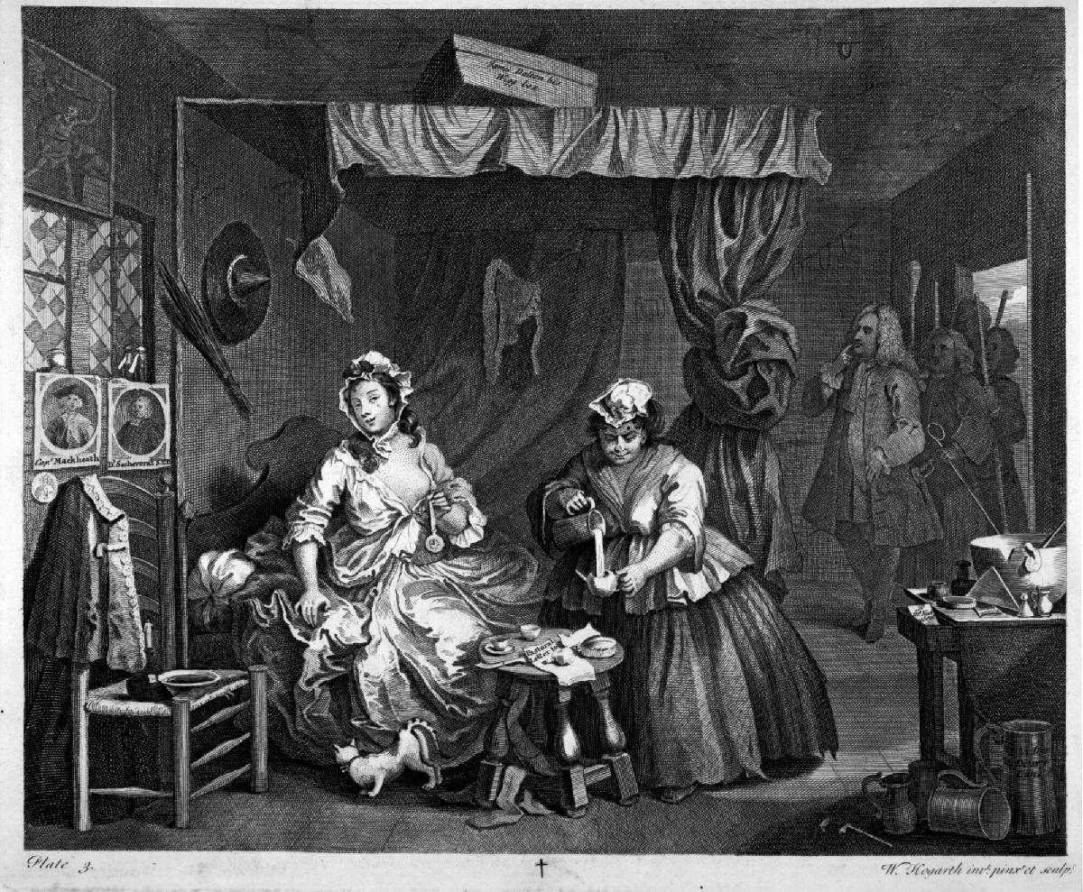 Moll looks alluringly towards the viewer, unaware that Justice John Gonson and his bailiffs have come to arrest her. The bottles of medicine around the room suggest that the small black spots on her face are more than just fashionable face patches and are, in fact, hiding the tell-tale signs of syphilis.