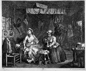Not on viewHaving insulted and betrayed her wealthy keeper (in Plate 2), in this scene, Moll has been cast out and “demoted” to the position of a common prostitute. No longer kept in the finest home, Moll’s room is cramped and dilapidated and the modest furnishings are well-worn. Looking around the room, evidence—like portraits of Captain Macheath and Dr. Sacheveral, and a wig box for James Dalton—suggests that Moll is now forced to entertain multiple clients in order to make ends meet. In the lower right corner of the print, a tankard contains a partial address, “…in Drury Lane,” which was located in Covent Garden, an area of London that was renowned for its brothels.
