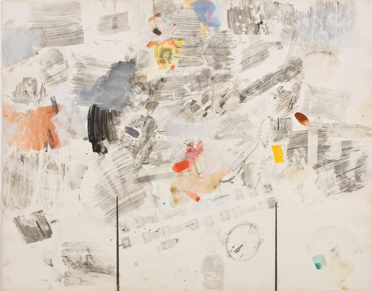 In the AMAM's Combine Drawing, Rauschenberg used traditional media- charcoal, crayon, and watercolor-to create an original work of art. But he also appropriated images from mass media- photographs of Sophia Loren, John F. Kennedy, and others-collaging them onto the white sheet of paper, then drawing and painting over them to create "combine," or hybrid drawing, that mixes media, genres, and objects.