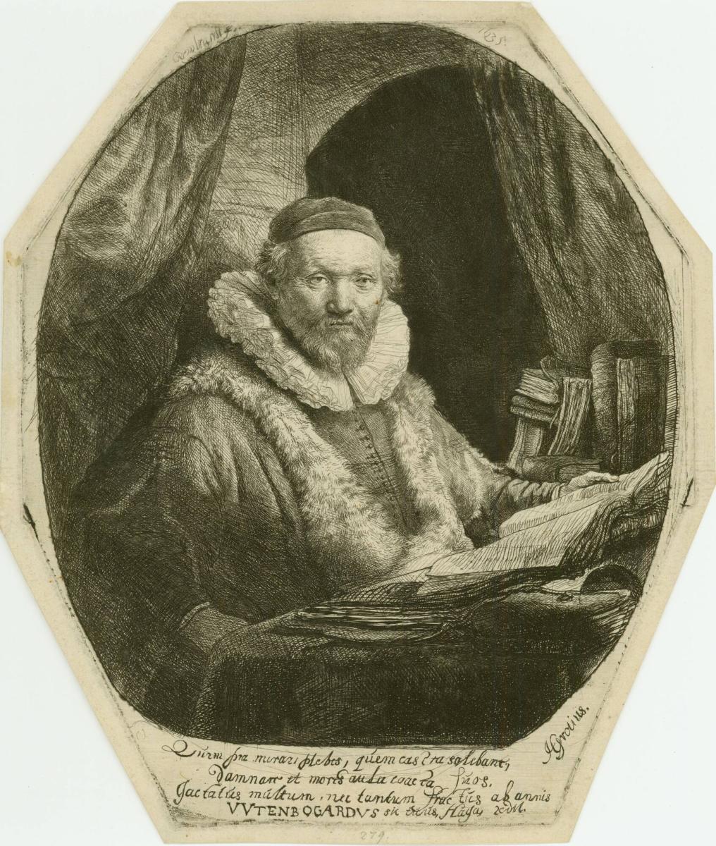 Not on viewThe majority of Rembrandt's portrait prints were made for private distribution to immediate family and friends, much like modern photographs. The laudatory inscription at the bottom of this print, however, suggests that it may have been commissioned for distribution to a wider circle of friends and co-religionists. Wytenbogaert (1557–1644), a powerful and influential preacher, was the leader of the Remonstrant movement in the