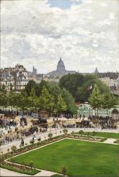 The dome of the Pantheon appears in the center distance, flanked by the church of St. Etienne-du-Mont and the dome of the Sorbonne. The Ile de la Cité is in the middle ground, separated from the Right Bank by the Seine, of which a small part is visible at right, under the French flag. The foreground, painted in brilliant green, shows the Garden of the Princess (Jardin de l'Infante), named for a Spanish princess who was briefly engaged to Louis XV in 1722, and whose apartments under the Galerie d'Apollon looked out over the garden. Human figures-so prominent in Monet's works to this point-are reduced to daubs of paint, signifying their movement on foot and in horse-drawn carriages through the transitional spaces of the grand boulevards flanking the Louvre and Seine.