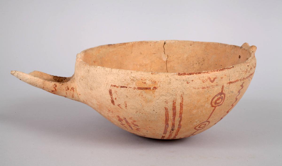 White Painted Ware I Bowl with Spout and String-Hole, Decorated with Wavy and Straight Lines