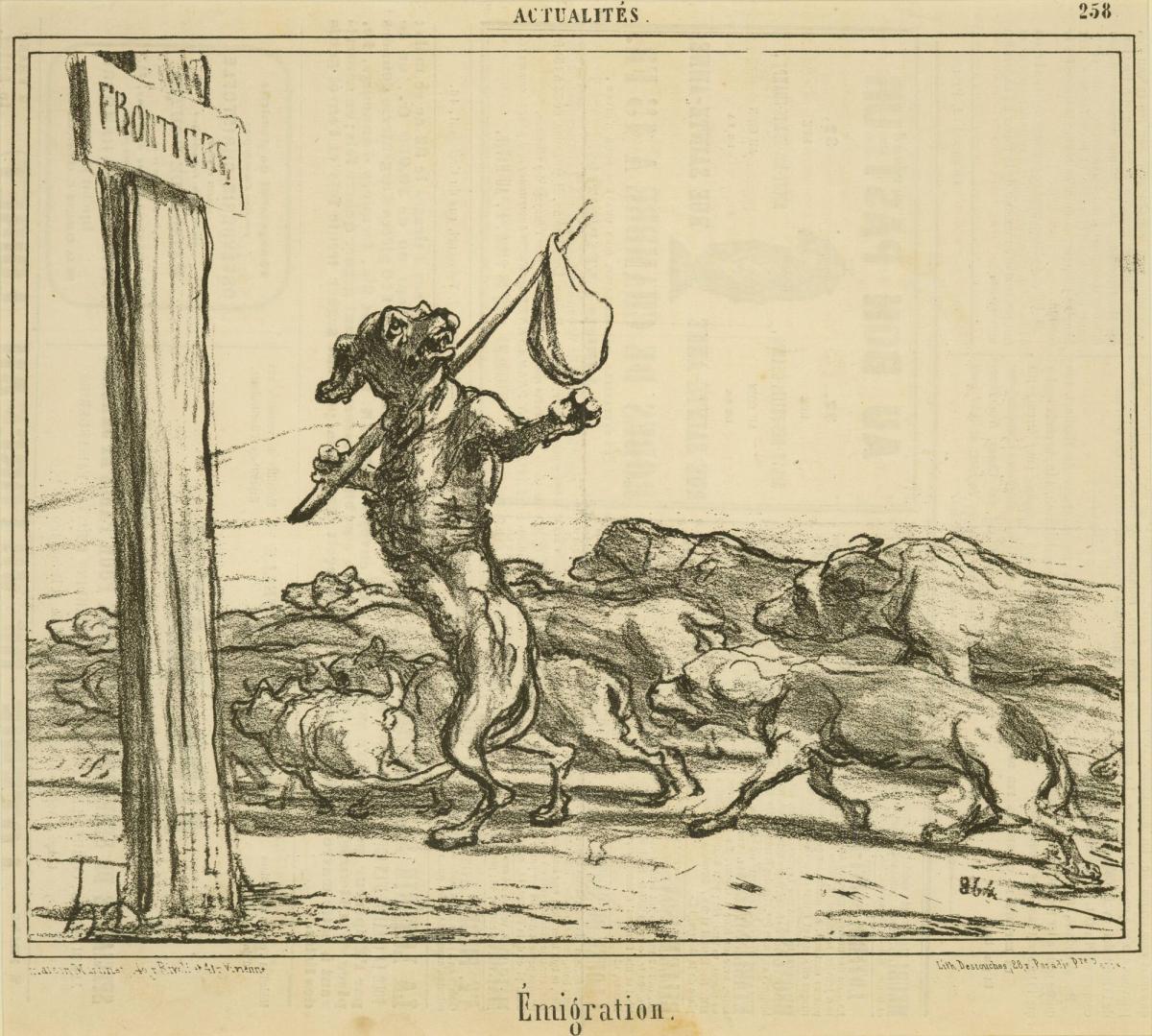 Not on viewIn 1855, a new tax defined dogs as taxable luxury items. It was believed that workers’ dogs were dirty disease carriers, and that only well-to-do bourgeois families could give a dog a proper home. When the law went into effect in 1856, almost 80,000 dogs were declared in Paris alone. Here Daumier imagines the rest of France’s dogs emigrating to neighboring countries in an act of doggie tax evasion.