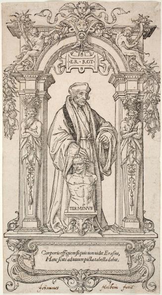 Not on viewDesiderius Erasmus (1465-1536), a Dutch humanist and scholar, held significant clout in the political and intellectual arenas of sixteenth-century Europe. It was through Erasmus' acquaintance that the German artist Hans Holbein the Younger gained entrance into important artistic circles in England. One of several portraits of Erasmus completed by Holbein, this print shows Erasmus standing under an ornately decorated arch, accompanied by the Roman god of borders, Terminus. Erasmus used this god, represented here as a bust on a boundary stone, as a personal emblem. Terminus' menacing gaze, Erasmus' dignified stance, and the intricate decorations that surround the arch all function as visual signifiers of Erasmus' importance and power, as well as of Holbein's esteem for the scholar.
