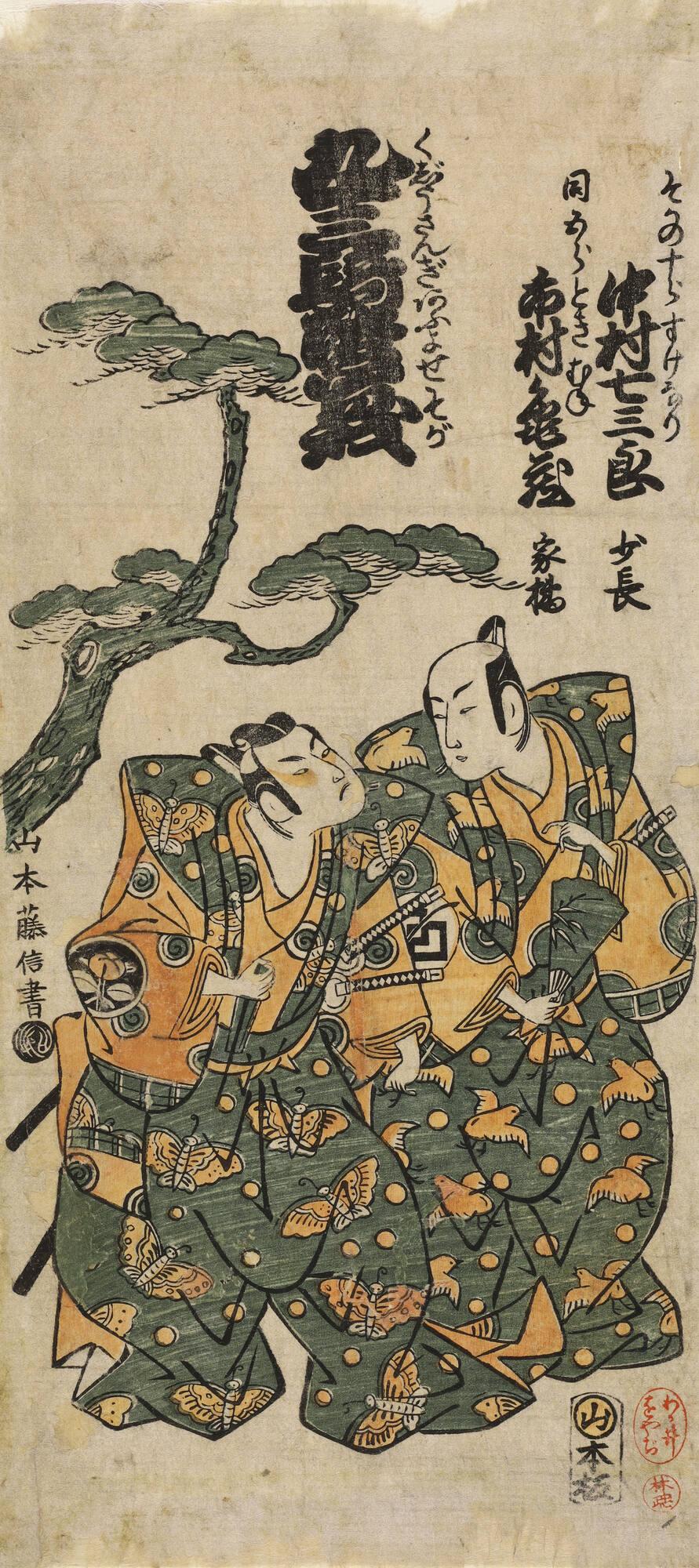 The Actors Nakamura Shichisaburō II (Shōchō) as Soga no Jūrō Sukenari and Ichimura Kamezō I (Kakitsu) as Soga no Gorō Tokimune in Kujūsanki Ōyose Soga, Ichimura Theater