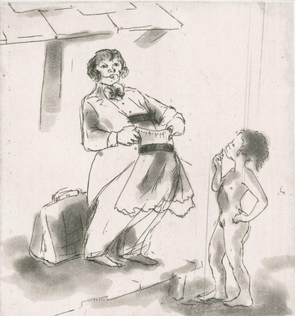 Not on viewThe title of this work comes from a line in the 1828 “Jump Jim Crow” song, which was frequently performed in blackface by white entertainer Thomas Dartmouth Rice (1808–1860). The pejorative term Jim Crow originated from this song, and the performance of this lyrical piece developed as a precursor to the traveling minstrel shows of the mid-19th century. Characteristic of Kara Elizabeth Walker’s larger oeuvre, this print calls attention to the creation and legacy of racial stereotypes in contemporary society. Do just so… portrays a white stage performer who offers a dress to a nude African American girl. The young girl looks inquisitively at the adult performer, perhaps contemplating why she is being asked to take part in a theatrical event.
