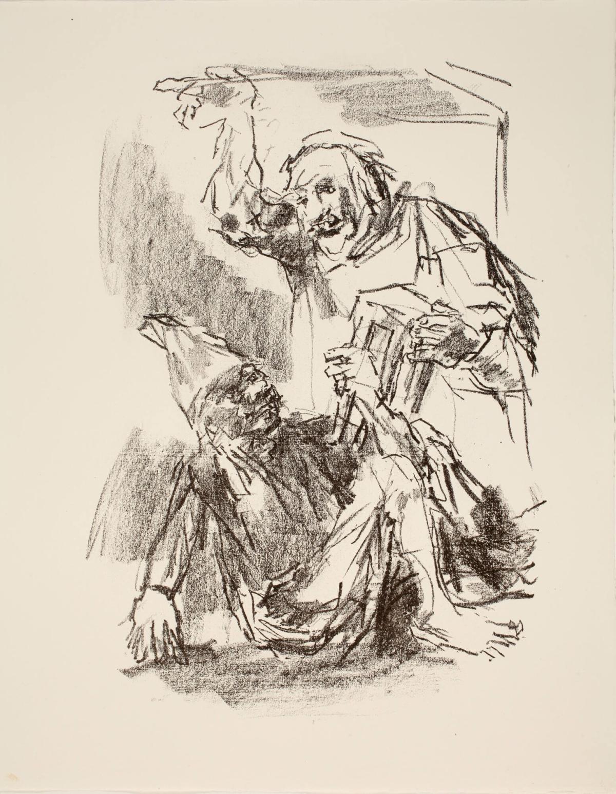 Not on viewIn 1963, Austrian painter Oskar Kokoschka created a series of 16 lithographs to illustrate William Shakespeare’s King Lear. One of the Bard’s most highly-regarded tragedies, the play follows the elderly King Lear’s descent into madness after foolishly dividing his estate among two of his three daughters based on their false flattery, resulting in a tragic outcome for all. Kokoschka’s series depicts critical points in the narrative which often correspond to dialogue by Lear and his daughters Goneril, Regan, and Cordelia, in addition to that of the other characters vying for the throne. Providing minimal information about the setting of each scene, Kokoschka’s sketchy compositions instead focus on the characters, each depicted with the artist’s characteristic energetic expressionism.