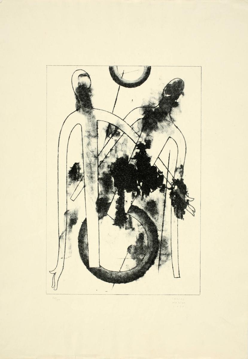 Not on viewInfluenced by the visual qualities of Pre-Columbian art, Carlos Mérida developed an approach to abstraction marked by geometric forms and flat areas of intense color. This work demonstrates Mérida’s interest in abstraction as well as Surrealism, to which the artist had been exposed during his European sojourns. Configurations of curved and straight lines delineate circles, triangles, crosses, and scrolls. These recognizable elements are juxtaposed with more ambiguous shapes and blotchy areas of texture. Despite the overall abstraction of the images, each maintains the suggestion of humanoid figures, resulting in a bizarre juxtaposition of the organic and the inorganic.