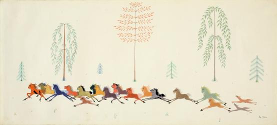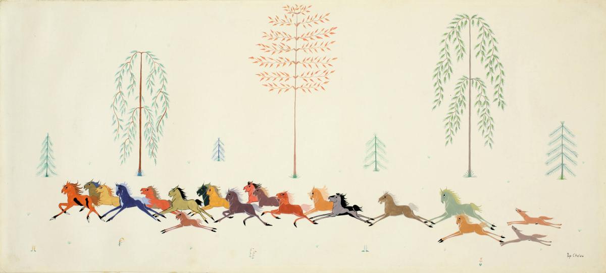 Not on viewPop Chalee, an artist of Taos, New Mexico, was known for her paintings of mythological horses and the series Enchanted Forest. Her spirited panoramic mural of brightly colored ponies made her famous as an American painter and muralist, although she also earned a living as a performer and singer. Her artistic style influenced many of the animal figures that Walt Disney later portrayed in his films. Although Chalee’s style has been fully appropriated into American popular culture, reexamining the artist’s original goal—to foster an understanding of her people and environment through art—helps us to appreciate her works as particular cultural expressions of a deep respect for the natural landscape of, and human-animal relations in, the Taos Pueblo.