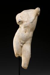 The Pothos type, which survives in Roman copies such as this, is possibly a replica of the Samothracian statue; the cult on the island was famous in Hellenistic and Roman times. The complete figure was a youth who held a long, stafflike object with both hands, leaning on it with crossed legs, and gazing up at Aphrodite. A goose, one of Aphrodite's attributes, appears at his feet. A long cloak draped over his left shoulder fell to the ground, acting as an additional support for the weight of marble (a remnant of the marble strut that would have connected to this is visible on the AMAM work). The torso, though fragmentary, is a graceful depiction of the subject, and is the only marble torso in the AMAM's ancient collection, which contains a number of portrait heads.