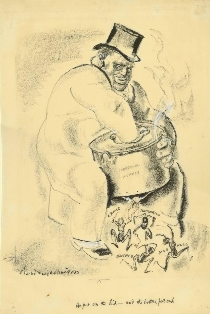 Not on viewRobinson was an illustrator and political cartoonist whose portrait of critic James Huneker appears in this exhibition. In the early years of the 20th century Robinson was virtually the founder of Leftist cartooning in the United States. One commentator said of him, "He killed the old, badly-drawn, cross-hatchline cartoon and developed a cartoon which was also a work of art… A few of his swift lines and a little of his grim, sardonic humor are more deadly than columns of editorials." This drawing appeared in the January 1920 issue of The Liberator, a socialist journal founded in 1918 when a similar publication, The Masses, was forced to stop production, and comments presciently on the economic and social unrest that would cause the Great Depression and lead to the rise of fascism in the coming decades. With Thomas Hart Benton, whose work appears in the case to the right, Robinson was also one of the founders of the American mural movement in the 1930s.